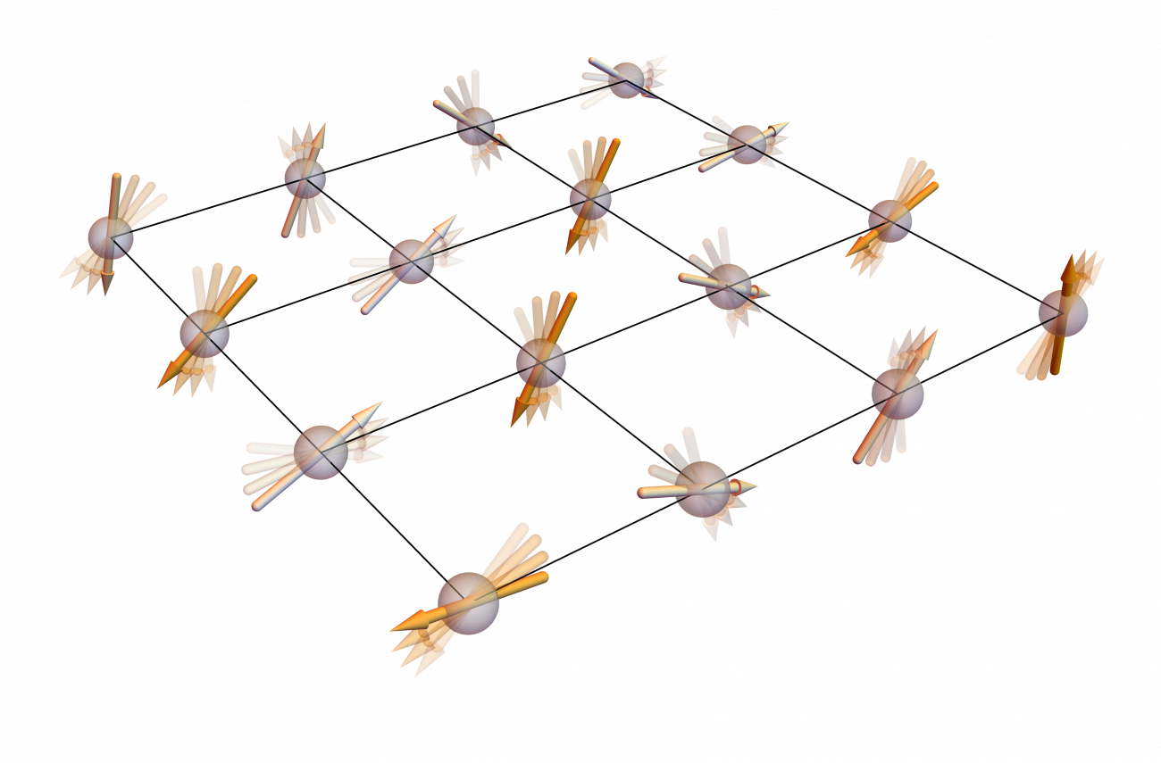 Abstract: "During my four years of Ph.D. research, I focused on the implementation and study of the dipolar XY spin model using a Rydberg atom-based quantum simulator, where the atoms are coupled through resonant Rydberg-Rydberg dipole interactions (see figure). We utilized our ability to address individual atoms in arrays to adiabatically prepare and study the properties of the 2D square dipolar XY ground state, which exhibits complex antiferromagnetic and ferromagnetic order.