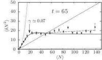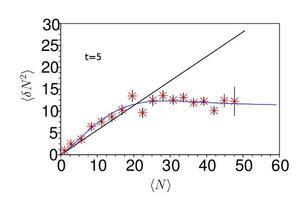 For weakly interacting gases (right), we observed fluctuations that are super-poissonian (due to bosonic bunching) at intermediate densities and which become sub-poissonian at large density, in the quantum quasi-condensate regime. At larger interaction strengths (left), the gas is close to the fermionised regime. Here the fluctuations are close to poissonian, a feature that resembles what is expected for a Fermi gas.