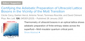 Certifying the adiabatic preparation of ultracold lattice bosons in the vicinity of the Mott transition, C. Carcy, G. Hercé, A. Tenart, T. Roscilde and D. Clément, Phys. Rev. Lett. 126, 045301 (2021) - selected as Editors' suggestion