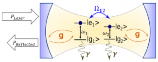 - De précédents travaux théoriques au sein de l'équipe ont permis également d'étudier les conséquences du couplage dipole-dipole de deux émetteurs identiques proches qui seraient par ailleurs mutuellement accordables en énergie. Le couplage de deux systèmes à deux niveaux donne naissance à de nouveaux quantiques hybrides, dits super-radiant ou sub-radiant, dont les temps de vie sont modifiés. Nous avons montré qu'en jouant en temps réel sur le couplage et le désaccord relatif entre les deux émetteurs, le temps de vie d'émission spontanée pouvait être contrôlé avec précision, sculptant ainsi dans le temps la forme du paquet d'onde du photon unique émis. Nous étudions la possibilité expérimentale de réaliser un tel couplage dans des systèmes à l'état solide, notamment avec les centres colorés d'hBN.