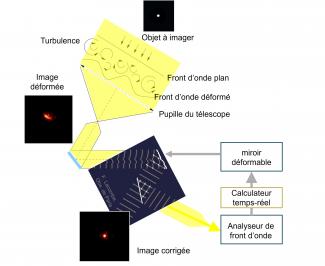 L’OA a révolutionné l’astronomie en rendant possible la compensation des effets désastreux de la turbulence. Le principe (voir la figure) consiste à corriger les déformations de l’image en l’observant après réflexion sur la surface d’un petit « miroir déformable » inséré sur le chemin optique. Des actionneurs, situés sous la très fine surface réfléchissante du miroir déformable, sont commandés en temps réel à partir de mesures des déformations fournies par un « analyseur de surface d’onde ». Le but est de produire idéalement après correction un front d’onde plan, c’est-à-dire une image parfaite dont la résolution est uniquement limitée par le diamètre du télescope.