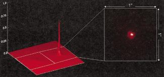 Image obtenue sur le télescope Keck : sans correction par OA (carré blanc de gauche) et avec correction par OA (pic à droite). Illustration extraite de [Wizinowich2000].