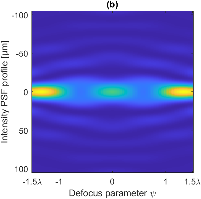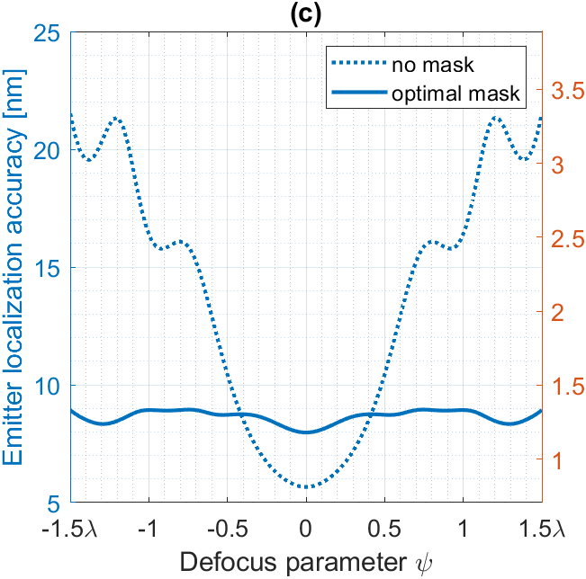 Figure 2 : (a) Masque optimal à cinq anneaux. (b) Variation du profil transversal de la PSF en fonction de la défocalisation lorsque le microscope est équipé d’un masque optimal. (c) Précision de localisation sans masque (pointillés) et avec masque (bleu) en fonction de la défocalisation.