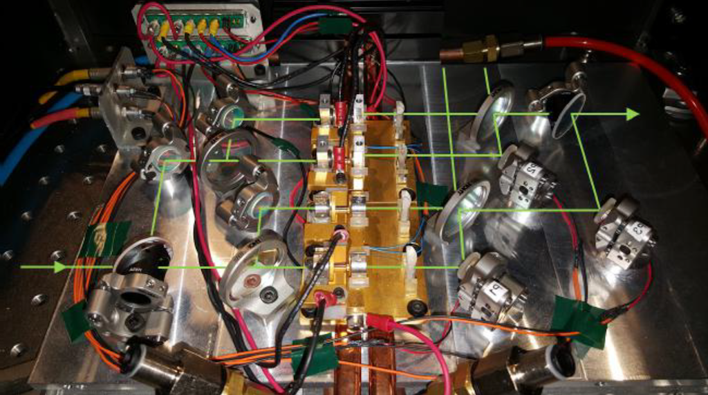 Dans cette configuration, les amplificateurs sont injectés en parallèle par une même source, et la phase des faisceaux amplifiés est stabilisée activement. Cette architecture a été validée avec quatre éléments en parallèle, jusqu'à une puissance combinée de 17 W correspondant à une efficacité de combinaison globale de 71% [2]. L'amélioration de la qualité spatiale du faisceau combiné, qui découle du nettoyage du faisceau réalisé lors du processus de superposition cohérente, a été mise à profit dans une expérience de conversion non-linéaire dans le visible : l'efficacité de conversion a ainsi été très significativement augmentée [1]. Enfin, un module compact (32,5 x 22,5 cm2) a été conçu et validé, à partir d'amplificateurs commerciaux [5].