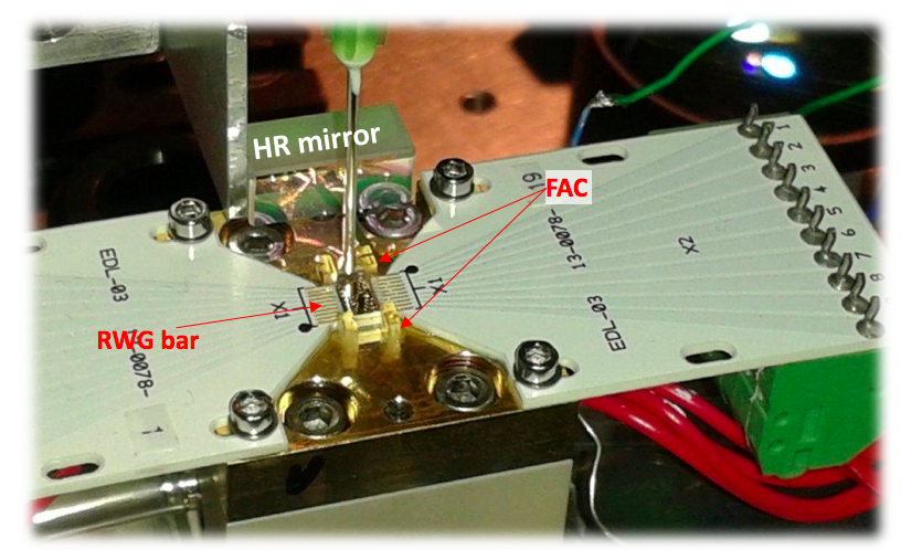 Nous avons étudié et mis en œuvre plusieurs géométries de cavité, pour exploiter différents processus de couplage (effet Talbot, filtrage spatial angulaire par un réseau de Bragg volumique, élément diffractif ...) [3,4]. Les meilleurs résultats ont été obtenus avec une barrette de cinq émetteurs à section évasée, dans une architecture de cavité dans laquelle la mise en phase des émetteurs est réalisée en face arrière, tandis que leur superposition cohérente est réalisée en face avant à l'aide d'un élément diffraction. Ainsi, une puissance maximale de 7,5 W a été obtenue [3].