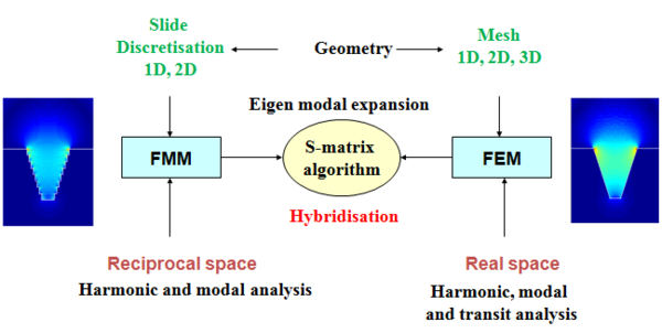Les méthodes mises en œuvre se basent sur l’hybridation de la méthode des éléments finis (FEM) avec la méthode modale de Fourier (FMM) ce qui permet de tirer profit des avantages des deux méthodes : modéliser des géométries de forme complexe, meilleure convergence dans le cas des métaux, inspection locale du champ associée à une analyse modale.